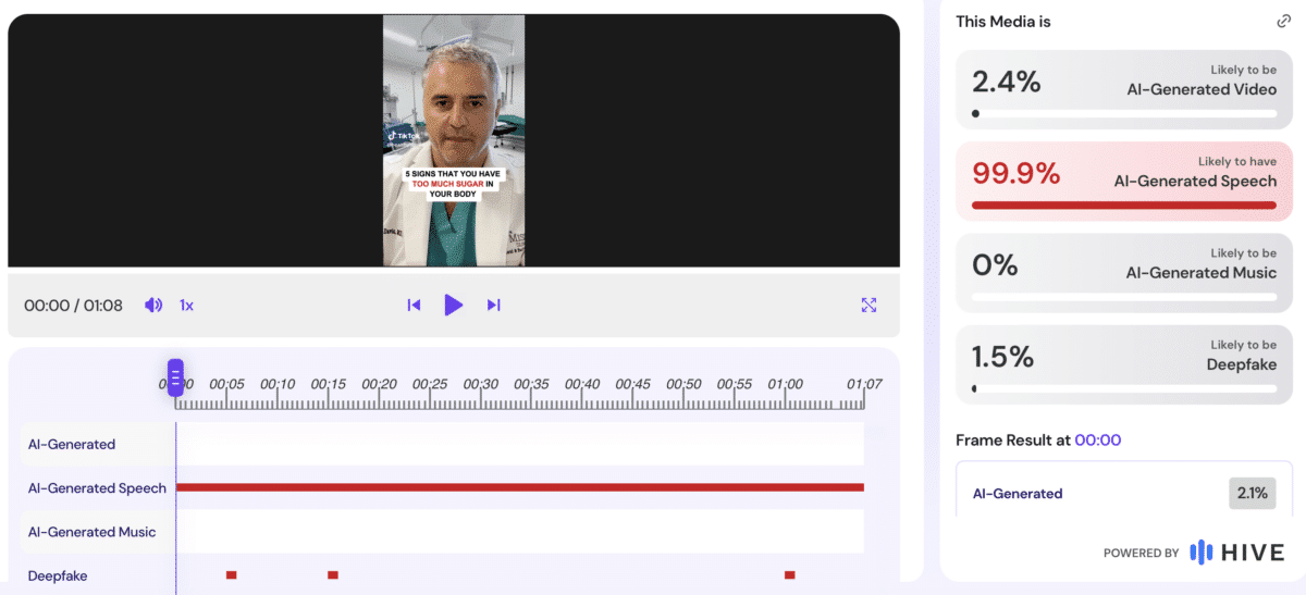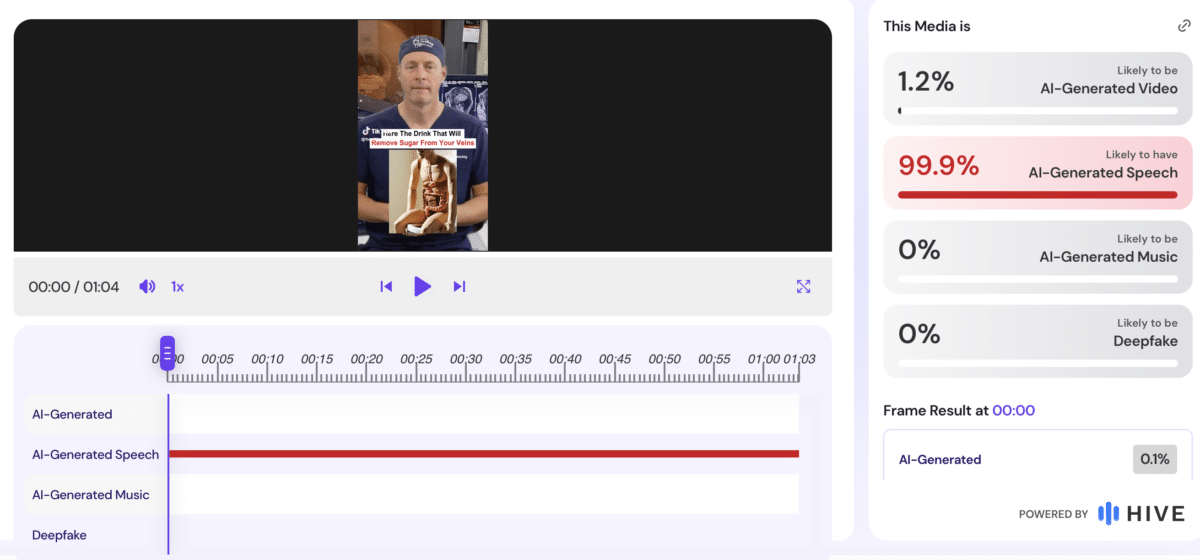 Analyses of the videos using Hive Moderation (a tool to detect AI-generated & deepfake content) generally indicated a high likelihood that AI was used to generate the speech in the video.