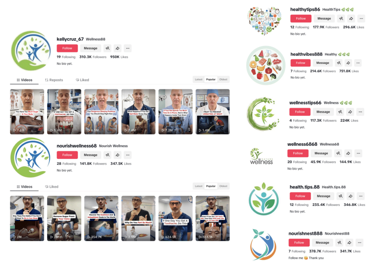 Apart from spreading health misinformation, another reason that these accounts are concerning is their ability to attract a large following. Most had several hundreds of thousands of followers, and the content they produced sometimes drew millions of views. For example, two of the most popular videos posted by the account @healthvibes888 racked up more than 14 million views, while the account @kellycruz_67 received more than seven million views for some of its videos.