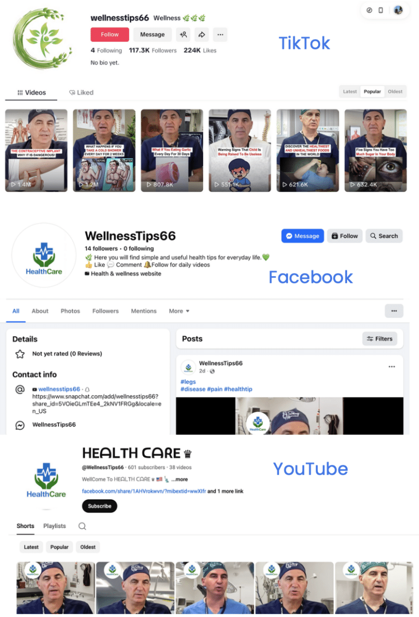 We were able to identify some of the people shown in these videos—they include weight loss doctor Garth Davis and orthopedic surgeons Paul Zalzal and Brad Weening, who host the podcast “Talking With Docs”. In fact, “Talking With Docs” was tipped off to the existence of such accounts, warning its followers on Facebook about deepfake videos of their hosts in January 2026.