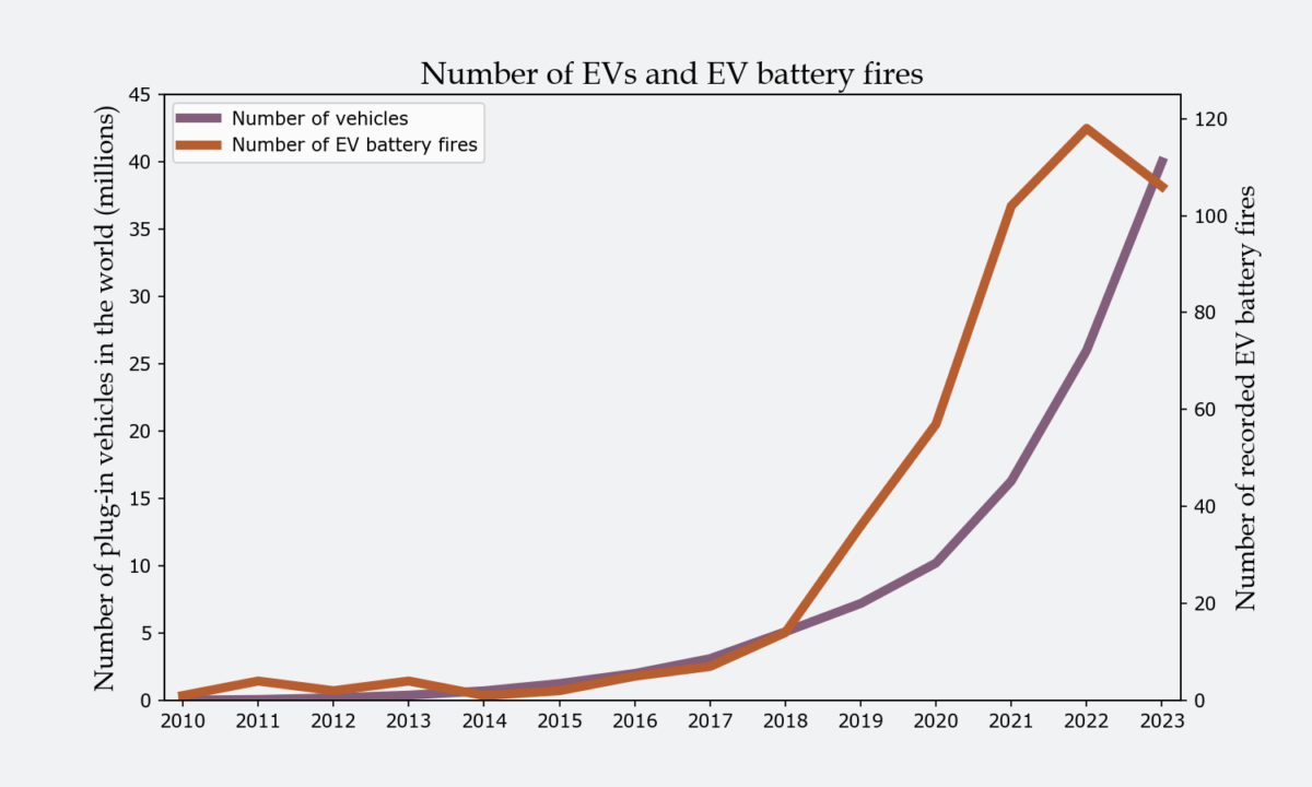 You might see stories calling attention to an “alarming trend” that the number of EV fires is growing. But that shouldn’t be surprising – the number of EVs on the road has dramatically increased, so naturally the number of battery fires could increase too[1]. This doesn’t necessarily mean a given EV is more likely to catch fire (Figure 1).