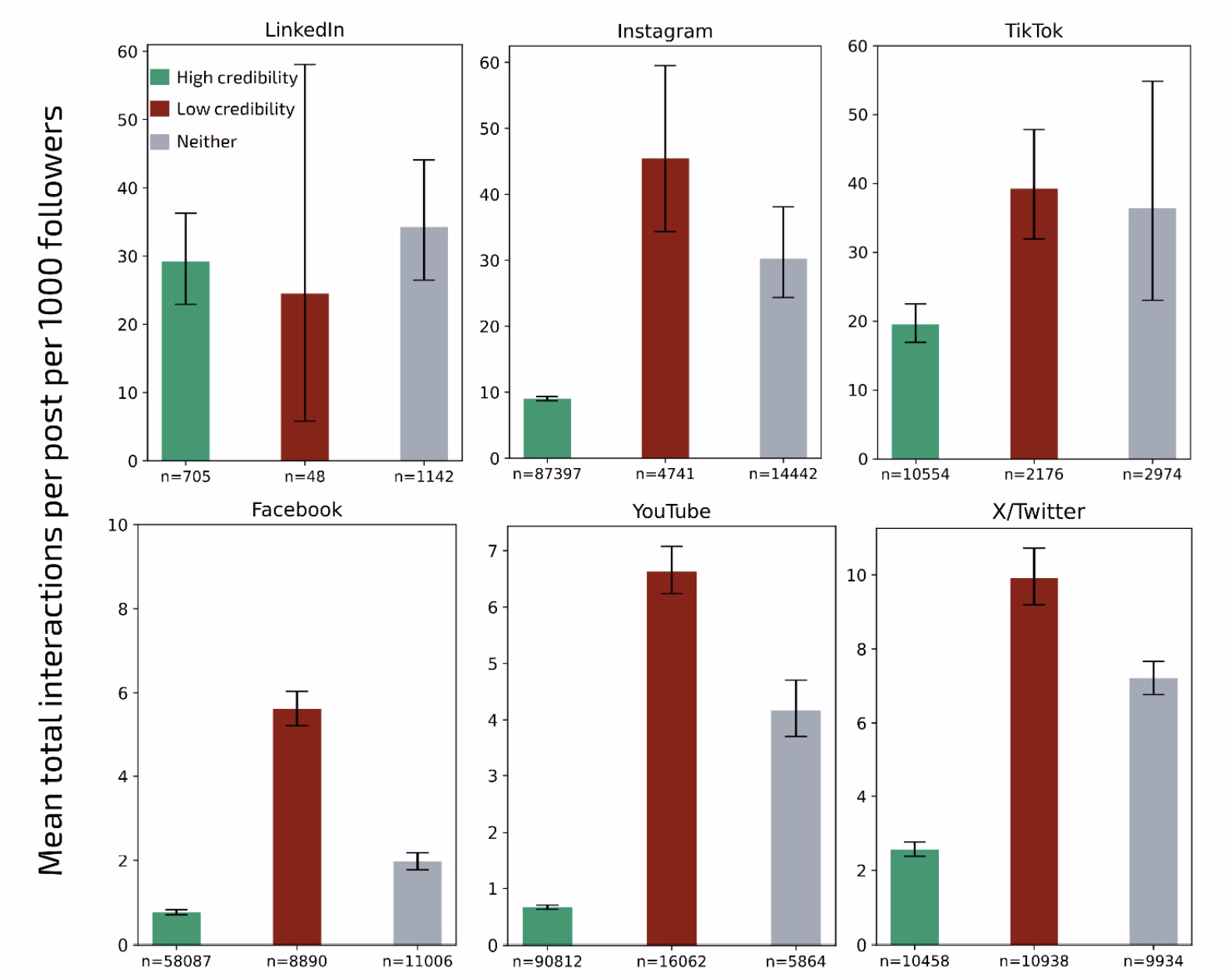 On YouTube low-credibility accounts get on average 8 times more interactions per post per 1 000 followers than high-credibility accounts. The ratio is ~7× on Facebook, around 5× on Instagram and X/Twitter, and about 2× on TikTok.