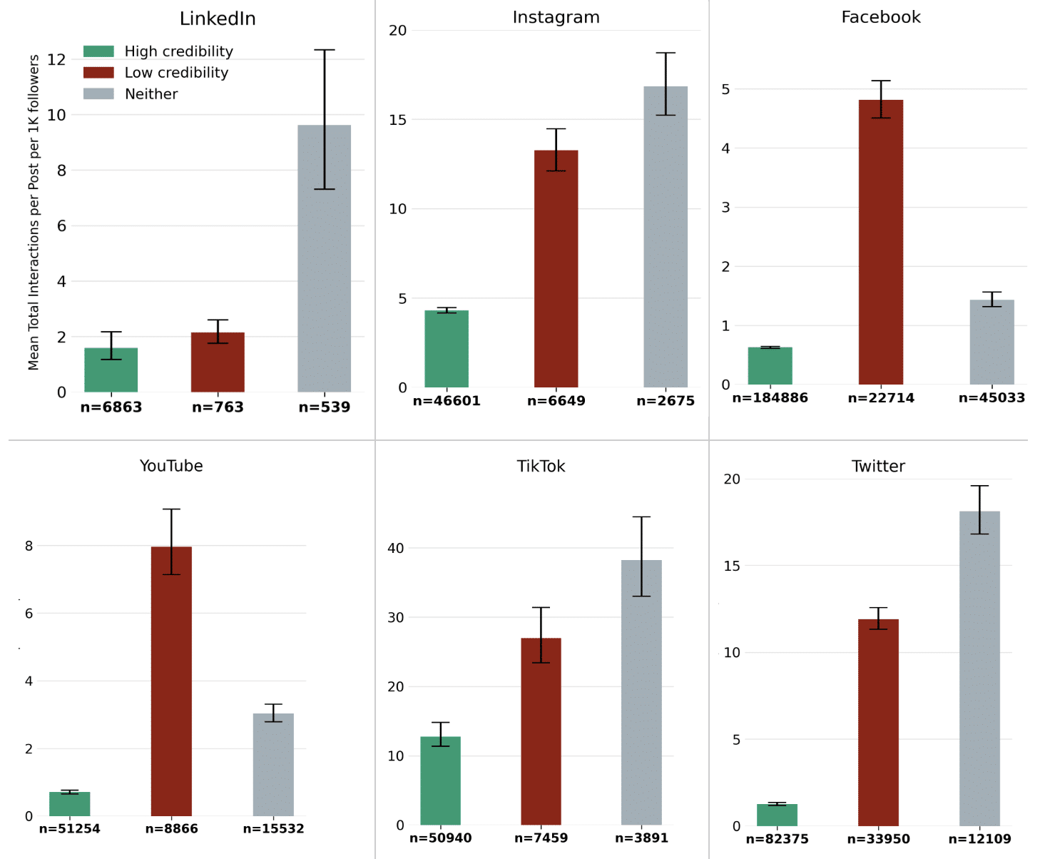 Figure 3 – Average interactions per post per 1 000 followers by account credibility, showing that low-credibility accounts get more interactions than credible accounts (except on LinkedIn).