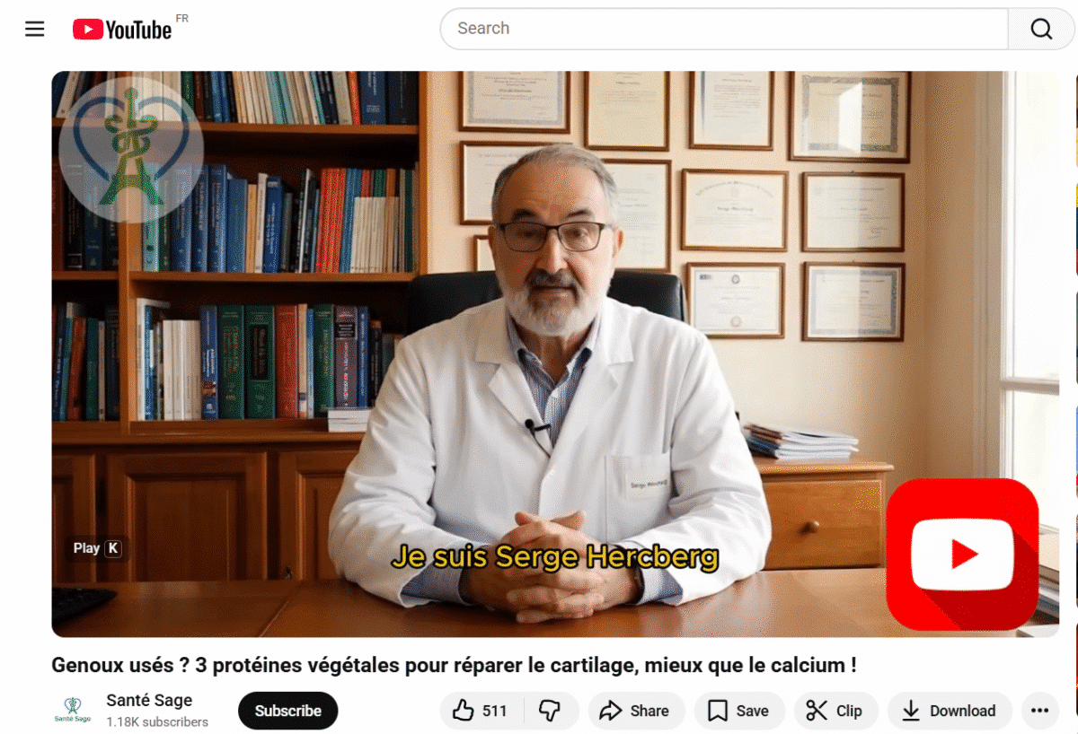 Son identité a été usurpée (Figure 1) par une chaîne YouTube, « Santé Sage », qui produit des vidéos générées par l’Intelligence Artificielle (lire l’interview dans le Feedback des scientifiques).