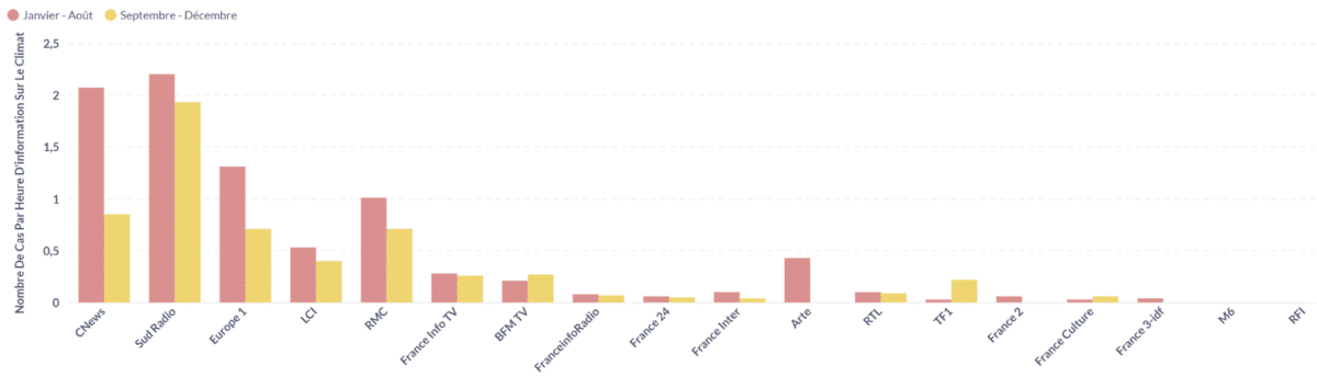 Si les huit premiers mois de l’année 2025 ont déjà fait l’objet d’une analyse dédiée, le présent article révèle les résultats préliminaires des quatre derniers mois de l’année. On observe une diminution nette du nombre de cas de mésinformation climatique en fin d’année, que ce soit en valeur absolue (Figure 1) ou par heure d’information sur le climat (Figure 2). Le nombre de cas par heure d’information sur le climat baisse notamment sur CNEWS et Arte (où il atteint zéro) comme sur la plupart des chaînes, alors qu’il augmente sur TF1 par exemple.