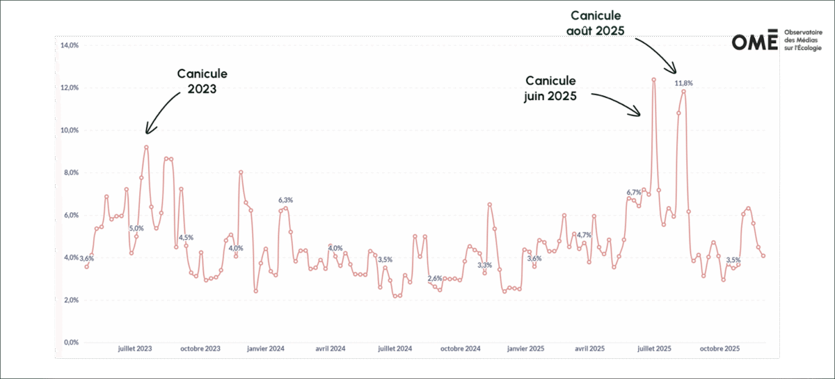 L’Observatoire mesure que 4,9% des temps d’antenne des programmes d’information ont été consacrés aux enjeux environnementaux en 2025, soit une augmentation de 33% par rapport à 2024 (3,7%). Cette tendance peut, entre autres, s’expliquer par une couverture particulièrement importante des deux canicules, atteignant 9% du temps d’antenne en juin, puis 11% en août 2025.
