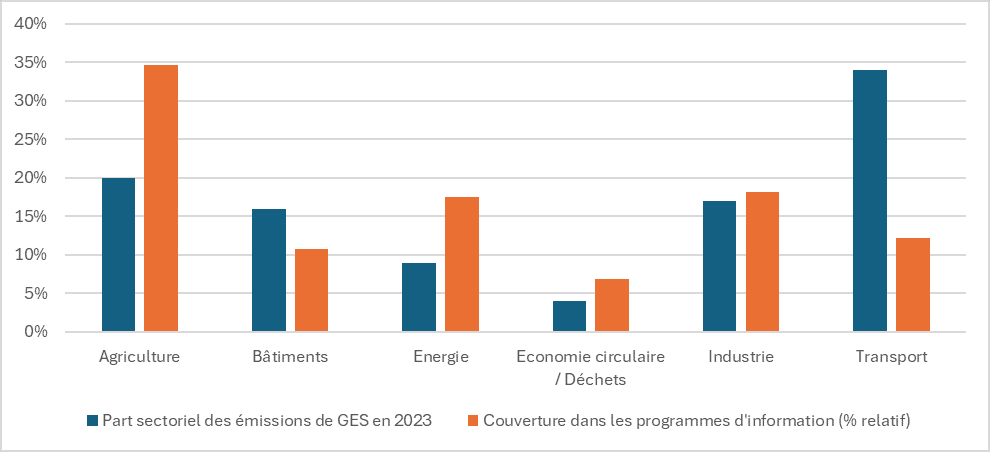 Pour mettre en évidence ce décalage entre le traitement médiatique et la responsabilité réelle des secteurs dans les émissions nationales, l’Observatoire compare la part de la couverture médiatique des enjeux environnementaux par secteur à leur poids dans les émissions de gaz à effet de serre (GES) de la France. On observe ainsi que l’agriculture est largement surreprésentée dans la couverture médiatique par rapport à son poids relatif dans les émissions de GES en France (35 % de la couverture médiatique des enjeux environnementaux contre 20 % des émissions sectorielles de GES), tandis que le secteur des transports présente la situation inverse (12 % de couverture médiatique contre 35 % des émissions de GES).