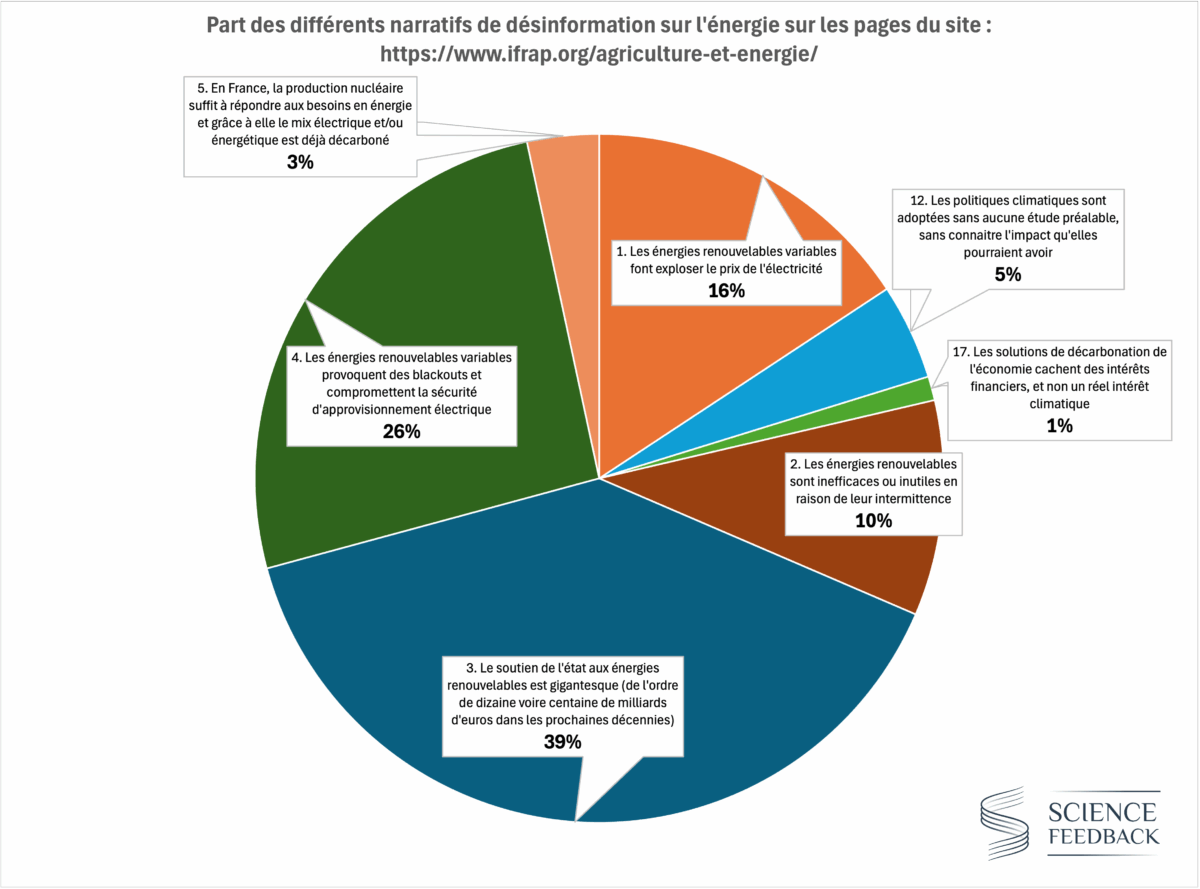Science Feedback a exploré internet à la recherche des premières apparitions d’un discours trompeur très récurrent dans l’audiovisuel (“les renouvelables font exploser le prix de l’électricité”). Nous avons découvert que la Fondation pour la recherche sur les administrations et les politiques publiques (IFRAP) est l’un de ces relais. Plus généralement, près d’un tiers des articles publiés sur leur site internet (dans la catégorie “Agriculture et énergie”) reprennent les discours trompeurs ou inexacts sur l’énergie.