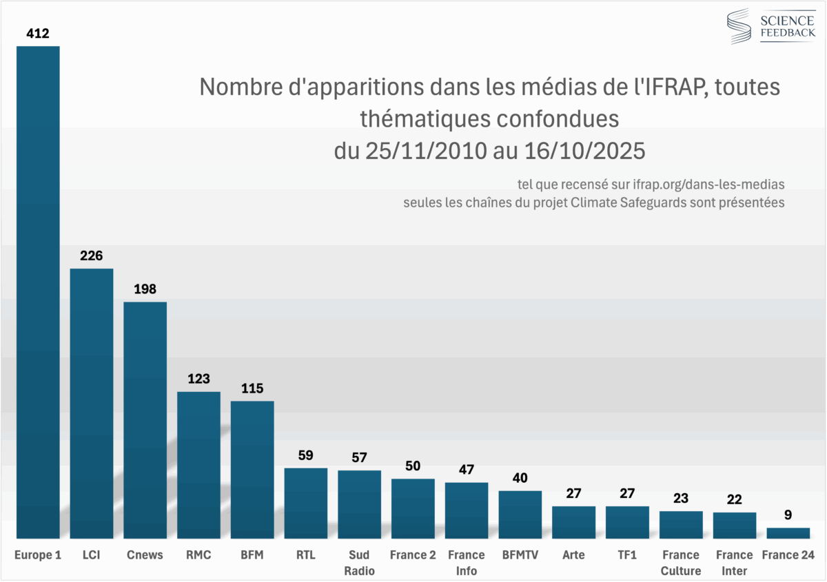 L’une de ces tactiques consiste à être présent dans les médias. Tous sujets confondus, l’IFRAP – et en particulier sa directrice Agnès Verdier-Molinié – recense sur son site internet plus de 4000 apparitions dans les médias de 2010 à aujourd’hui. Europe 1 arrive largement en tête (412 apparitions recensées), suivi du Figaro (266), CNews (198) et LCI (187), comme le montre notre compilation en figure 4. Si nous compilons uniquement le panel des 18 chaînes audiovisuelles étudiées dans le projet Climate Safeguards, Europe 1, CNews, LCI et RMC sont les chaînes où l’IFRAP a le plus souvent la parole.