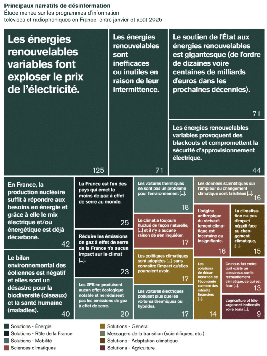 En 2024 et 2025, les renouvelables sont une nouvelle fois décriés sous la plume de Bernard Kasriel, ancien directeur général du n°1 de la cimenterie Lafarge, un secteur responsable d’environ 3% des émissions mondiales de gaz à effet de serre. On y retrouve cette fois pêle-mêle des articles relatant un manque de fiabilité des renouvelables dû à leur intermittence, un surcoût d’au moins “300 milliards d’euros lié au développement accéléré des énergies renouvelables intermittentes” ou encore les risques de black-out qui y seraient liés. Toutes ces affirmations sont parmi les plus fréquentes dans l’audiovisuel (figure 2), et leur caractère trompeur ou erroné est détaillé dans le rapport Climate Safeguards.