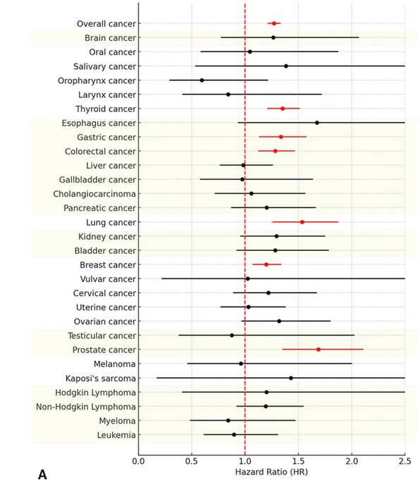 Les résultats sont principalement présentés dans la Figure 1 de l’étude, dont la partie A ci-dessous est largement reprise sur les réseaux sociaux qui la présentent de manière trompeuse comme une relation de causalité entre vaccin et cancer.