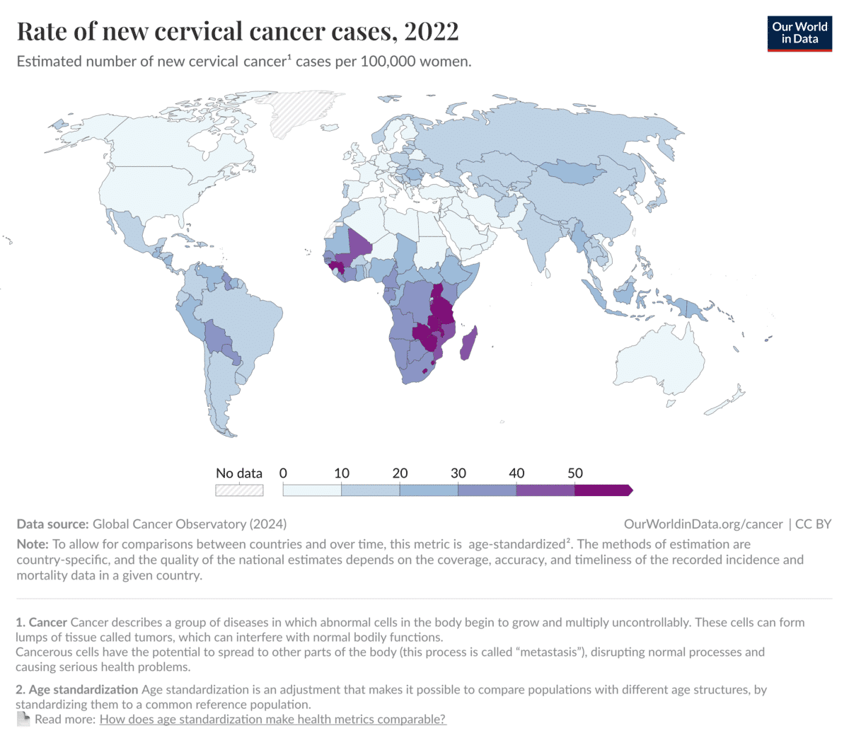 As Figure 2 below shows, populations in low- and middle-income countries face the highest rates of cervical cancer incidence and mortality. This is mainly a result of lack of access to vaccines, cervical screening, and treatment.