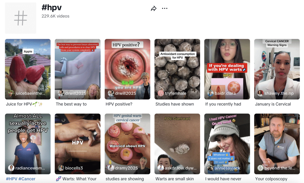 Many posts contain discussions of women’s experiences coping with HPV infection. But more concerning are the numerous posts promoting ways to treat HPV infection with dietary supplements, herbs, and topical gels. The goal of using such treatments, one user asserted, is to “support [the] immune system” and “clear HPV naturally”. Some of these posts have received hundreds of thousands of views on TikTok.