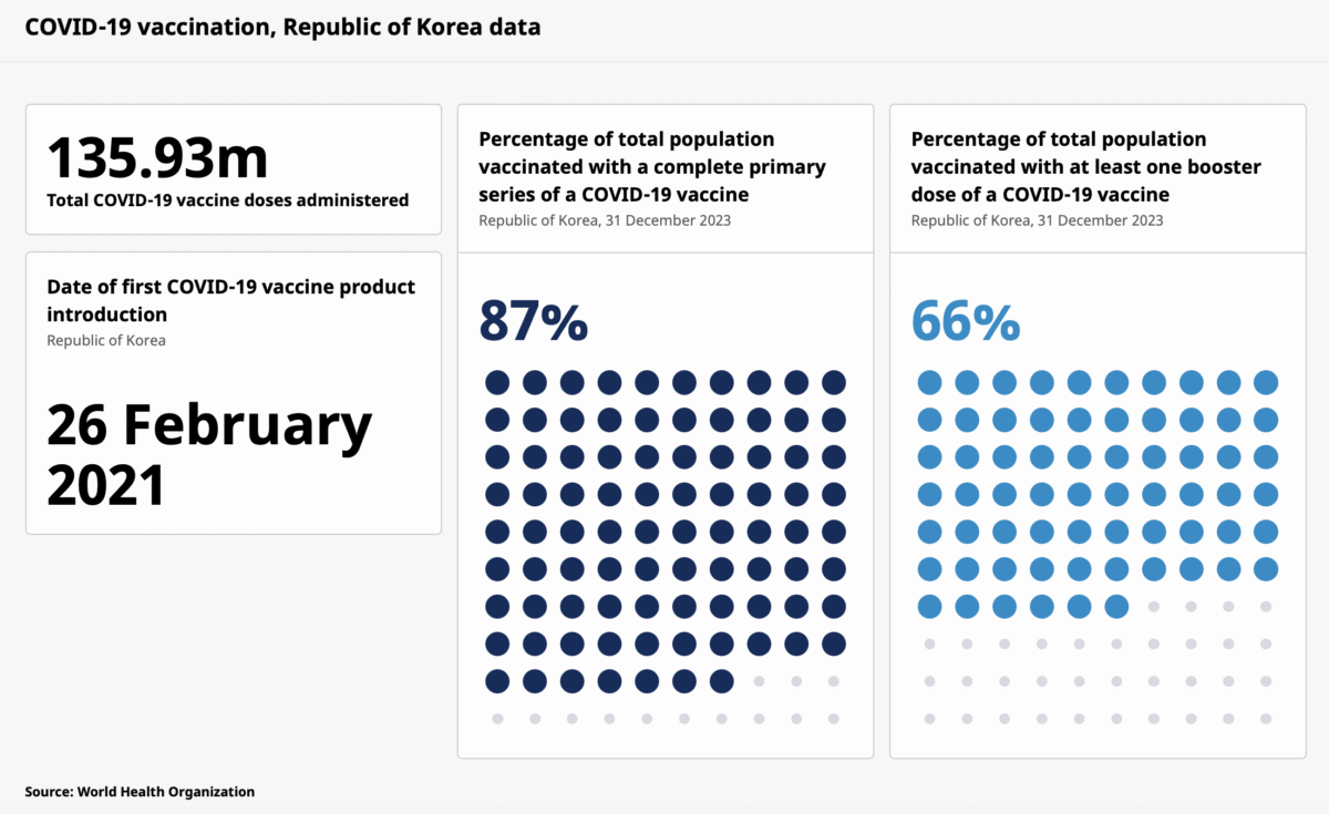 For context, most of South Korea’s population received at least one dose of COVID-19 vaccine. According to data from the World Health Organization, roughly 87% of the population completed the primary vaccination series as of 31 December 2023 (see Figure 1 below). This means that only 13% of people remained unvaccinated or didn’t complete the primary series. On top of that, 66% received a booster dose.