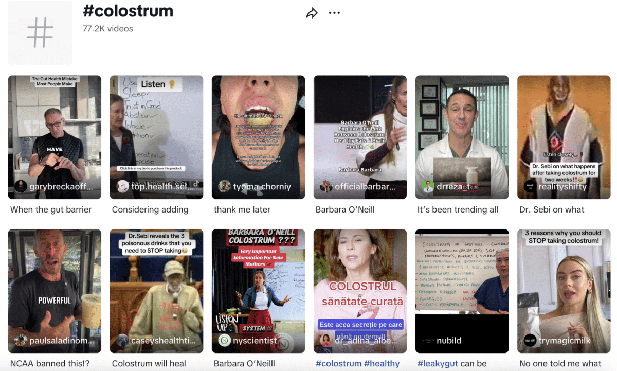 Similar claims have proliferated across social media platforms; for instance, there are more than 77,000 videos carrying the hashtag #colostrum on TikTok. And the claims have spread in multiple languages, including French, Polish, and Spanish.