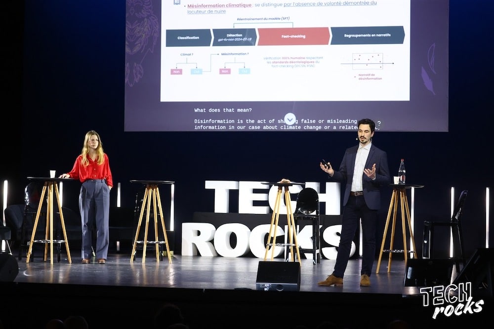 Eva Morel, Secretary General of QuotaClimat, and Emmanuel Vincent, Founder and Executive Director of Science Feedback, took the stage at Tech.Rocks Summit 2025 to present the AI tool developed within the Climate Safeguards project.